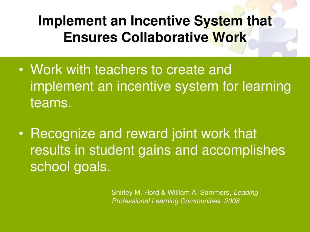 Implement an Incentive System that Ensures Collaborative Work • Work with teachers to create and implement an incentive system for learning teams. • Recognize and reward joint work that results in student gains and accomplishes school goals. Shirley M. Hord & William A. Sommers, Leading Professional Learning Communities, 2008