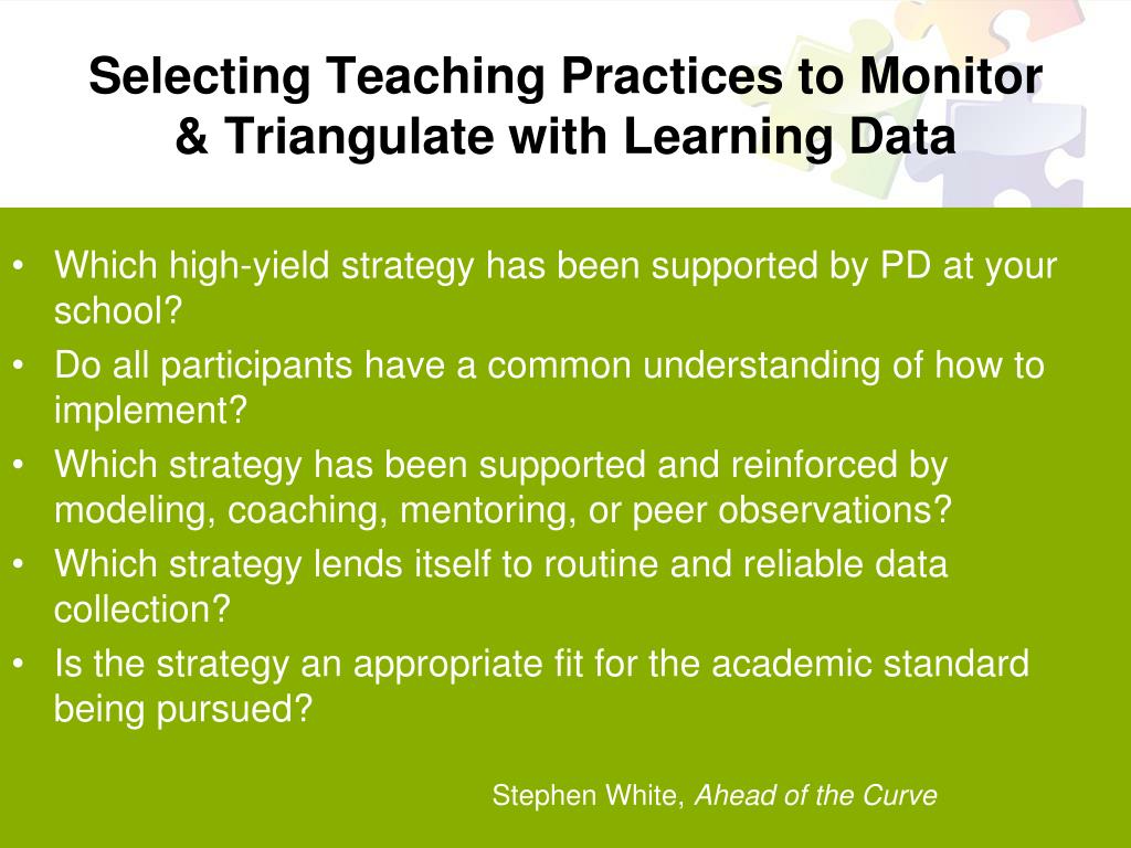 Selecting Teaching Practices to Monitor & Triangulate with Learning Data • Which high-yield strategy has been supported by PD at your school? • Do all participants have a common understanding of how to implement? • Which strategy has been supported and reinforced by modeling, coaching, mentoring, or peer observations? • Which strategy lends itself to routine and reliable data collection? • Is the strategy an appropriate fit for the academic standard being pursued? Stephen White, Ahead of the Curve