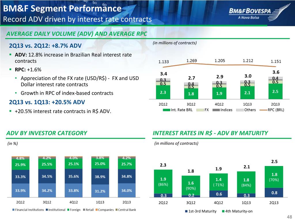 BOVESPA Segment performance Record volumes driven by turnover velocity AVERAGE DAILY TRADING VOLUME (ADTV) AND MARGIN • 2Q13 vs. 2Q12: + 8.5% ADTV • 13.9% growth of foreign investors’ ADTV, due to the activity of high frequency traders (HFTs) • 9.6% increase of institutional investors’ ADTV • Increase of turnover velocity, which hit 81.6% • Margins fell due to changes in the fee policy and the product mix (lower participation of derivatives) • 2Q13 vs. 1Q13: +10.3% ADTV • 10.1% growth in cash equities ADTV and 19.6% growth in options (equity/index) ADTV ADTV BY INVESTOR CATEGORY AVERAGE MARKET CAP. AND TURNOVER VELOCITY (in R$ billions) 47