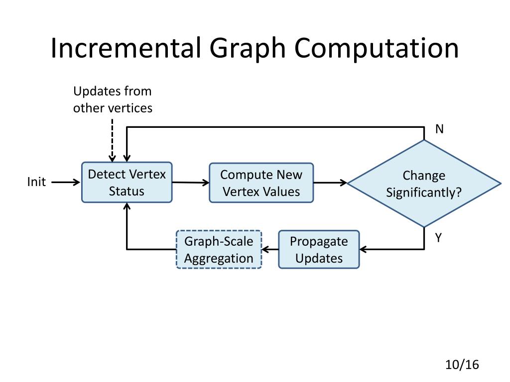 Incremental Graph Computation Updates from other vertices N Change Significantly? Detect Vertex Status Compute New Vertex Values Init Y Graph-Scale Aggregation Propagate Updates