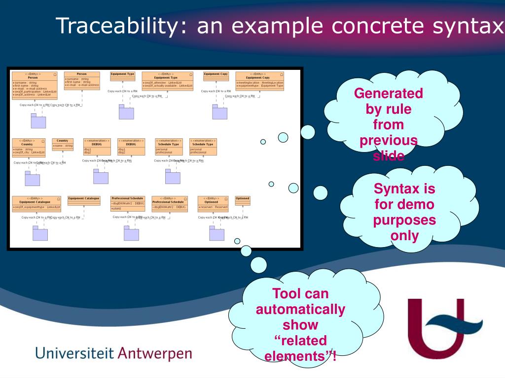 Traceability: an example concrete syntax Generated by rule from previous slide Syntax is for demo purposes only Tool can automatically show “related elements”!