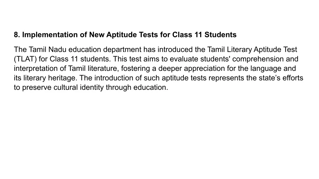 8. Implementation of New Aptitude Tests for Class 11 Students The Tamil Nadu education department has introduced the Tamil Literary Aptitude Test (TLAT) for Class 11 students. This test aims to evaluate students' comprehension and interpretation of Tamil literature, fostering a deeper appreciation for the language and its literary heritage. The introduction of such aptitude tests represents the state’s efforts to preserve cultural identity through education .