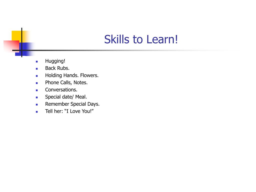 Skills to Learn! • Hugging! • Back Rubs. • Holding Hands. Flowers. • Phone Calls, Notes. • Conversations. • Special date/ Meal. • Remember Special Days. • Tell her: “I Love You!”