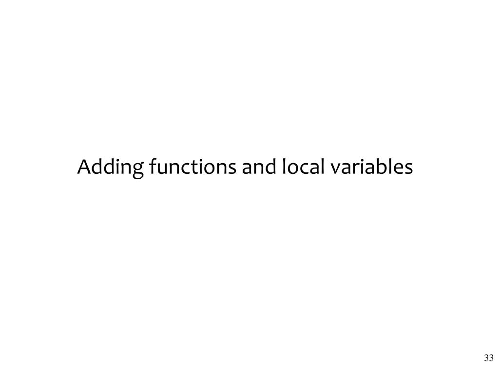 We now add functions Functions will have parameters and local variables Our core language: E := n | E+E | E-E | E/E | E*E | function(id*) { E } // the (anonym) function value | E(E*) // function application (call) | id // an identifier (var name) | let id = E in E // let binding (var declaration)