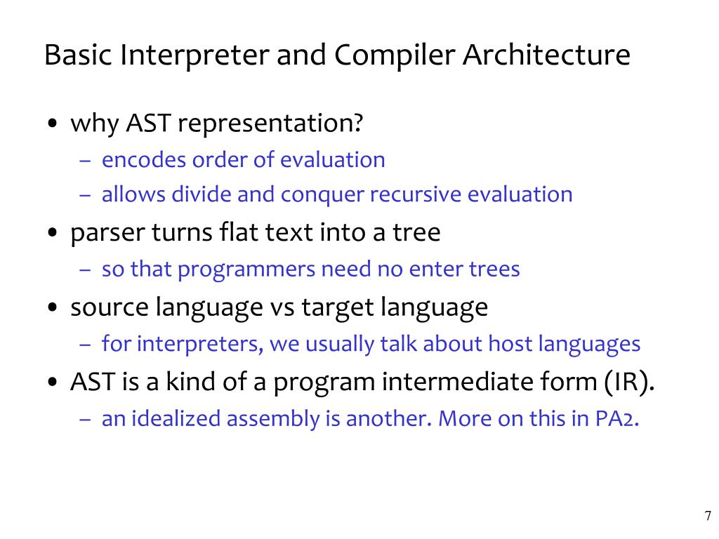 Basic Interpreter and Compiler Architecture • why AST representation? • encodes order of evaluation • allows divide and conquer recursive evaluation • parser turns flat text into a tree • so that programmers need no enter trees • source language vs target language • for interpreters, we usually talk about host languages • AST is a kind of a program intermediate form (IR). • an idealized assembly is another. More on this in PA2.