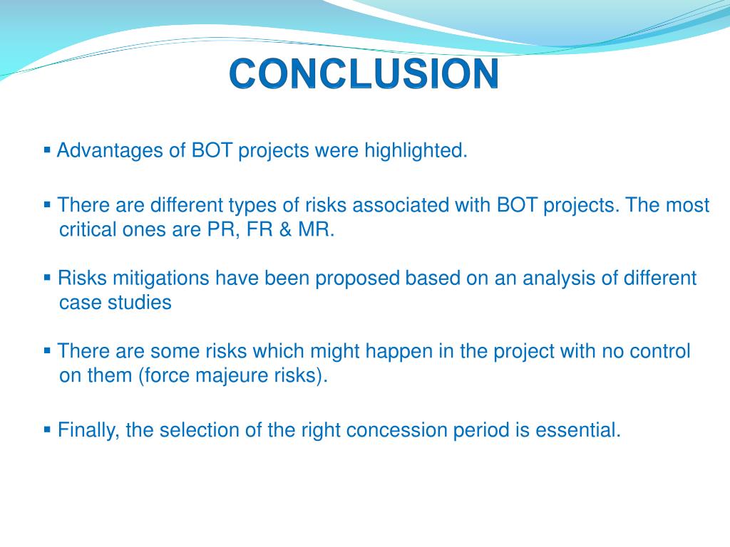 CONCLUSION • Advantages of BOT projects were highlighted. • There are different types of risks associated with BOT projects. The most • critical ones are PR, FR & MR. • Risks mitigations have been proposed based on an analysis of different • case studies • There are some risks which might happen in the project with no control • on them (force majeure risks). • Finally, the selection of the right concession period is essential.