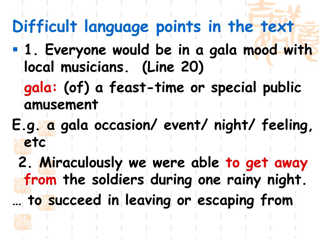 Difficult language points in the text • 1. Everyone would be in a gala mood with local musicians. (Line 20) gala: (of) a feast-time or special public amusement E.g. a gala occasion/ event/ night/ feeling, etc 2. Miraculously we were able toget away from the soldiers during one rainy night. … to succeed in leaving or escaping from