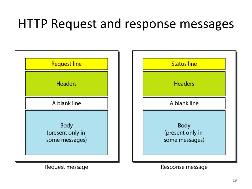 Structure of a server response • Similarly to a client request, a server response is formed of text directives, divided in three different blocks: • The first block, the status line, consists of an acknowledgment of the HTTP version used, followed by a response status codes. • The subsequent block contains responseheaders, giving the client some information about the data sent and ends with an empty line. • The final block is the data block/response body, which contains the data (if any).