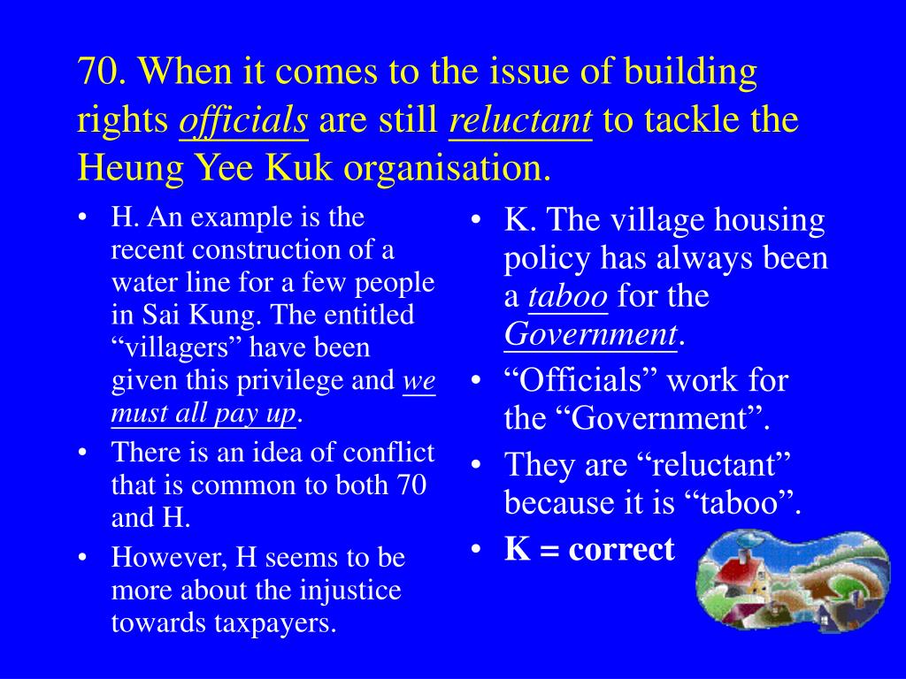 H. An example is the recent construction of a water line for a few people in Sai Kung. The entitled “villagers” have been given this privilege and we must all pay up. There is an idea of conflict that is common to both 70 and H. However, H seems to be more about the injustice towards taxpayers. K. The village housing policy has always been a taboo for the Government. “Officials” work for the “Government”. They are “reluctant” because it is “taboo”. K = correct 70. When it comes to the issue of building rights officials are still reluctant to tackle the Heung Yee Kuk organisation.
