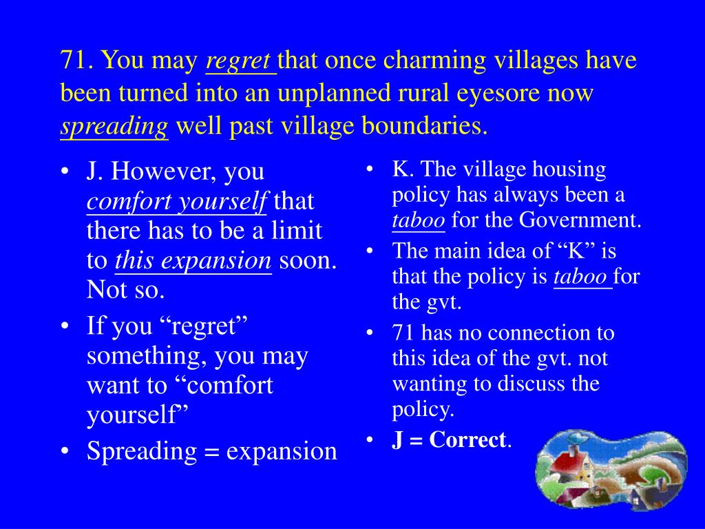 J. However, you comfort yourself that there has to be a limit to this expansion soon. Not so. If you “regret” something, you may want to “comfort yourself” Spreading = expansion K. The village housing policy has always been a taboo for the Government. The main idea of “K” is that the policy is taboo for the gvt. 71 has no connection to this idea of the gvt. not wanting to discuss the policy. J = Correct. 71. You may regret that once charming villages have been turned into an unplanned rural eyesore now spreading well past village boundaries.