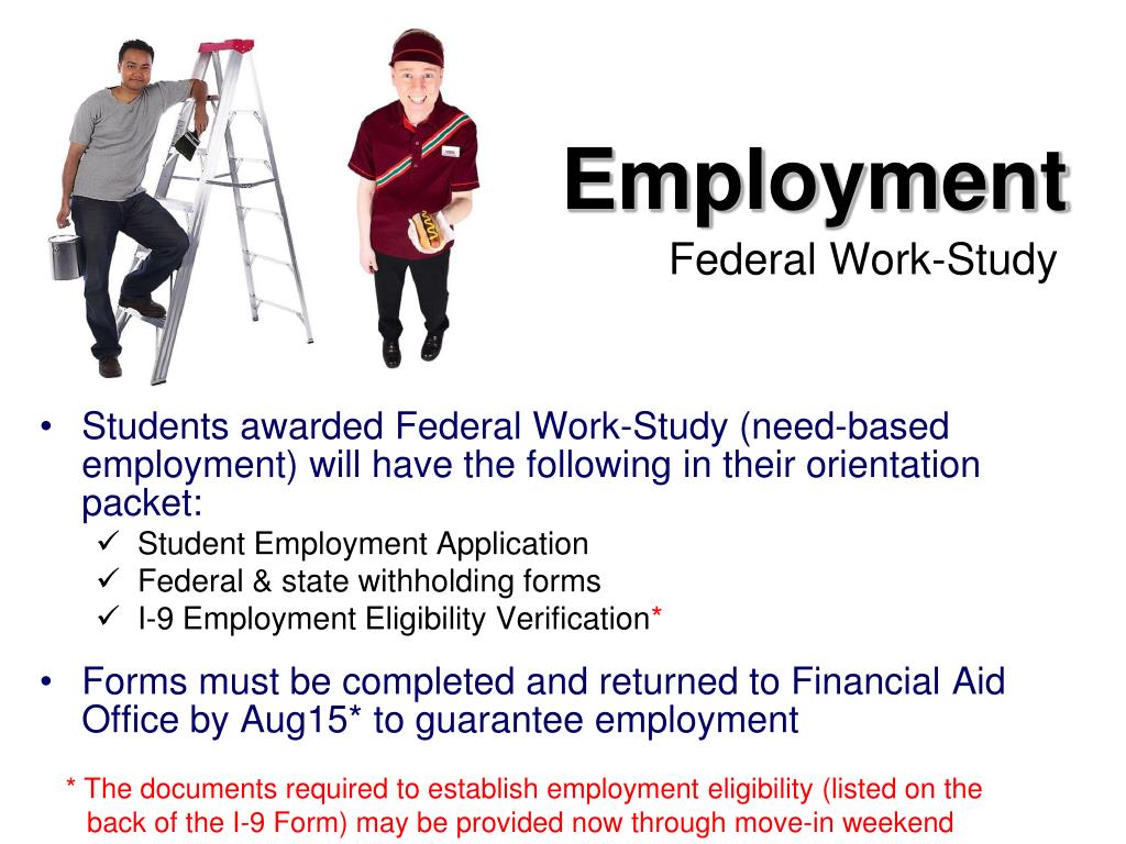Federal Work-Study Employment • Students awarded Federal Work-Study (need-based employment) will have the following in their orientation packet: • Student Employment Application • Federal & state withholding forms • I-9 Employment Eligibility Verification* • Forms must be completed and returned to Financial Aid Office by Aug15* to guarantee employment * The documents required to establish employment eligibility (listed on the back of the I-9 Form) may be provided now through move-in weekend