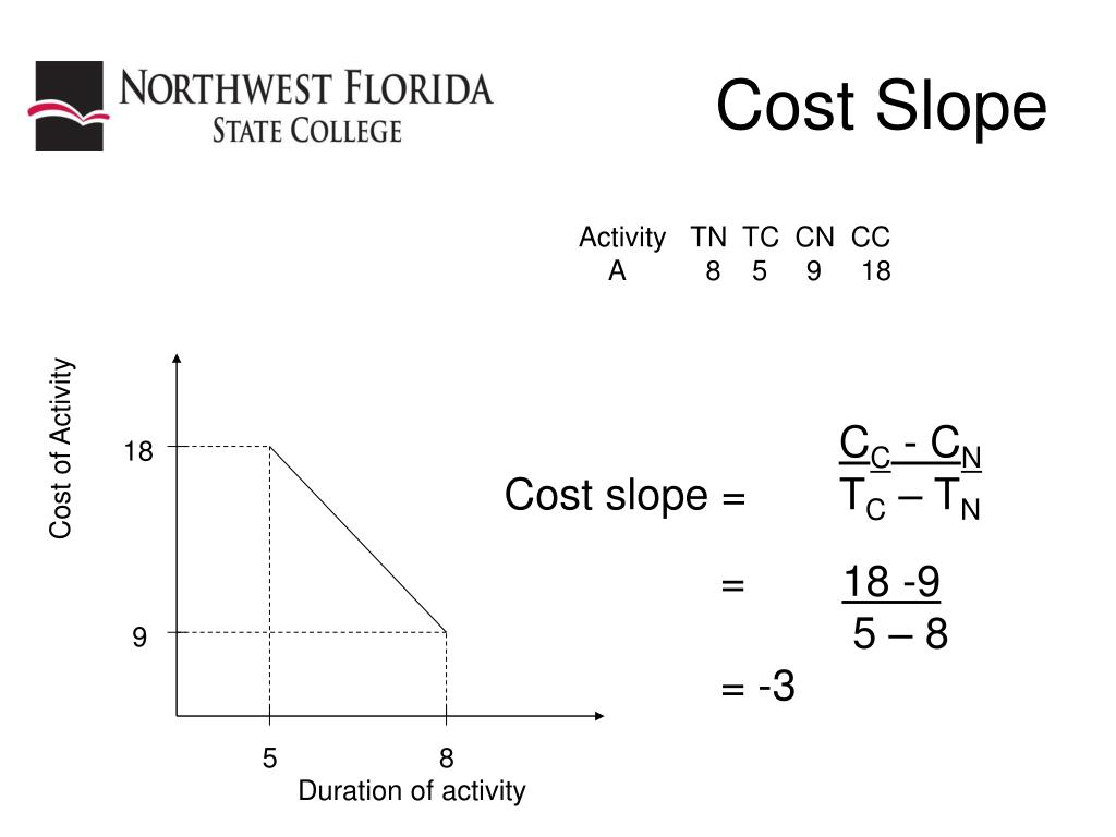 Cost Slope Activity TN TC CN CC A 8 5 9 18 CC - CN Cost slope = TC – TN = 18 -9 5 – 8 = -3 Cost of Activity 18 9 5 8 Duration of activity