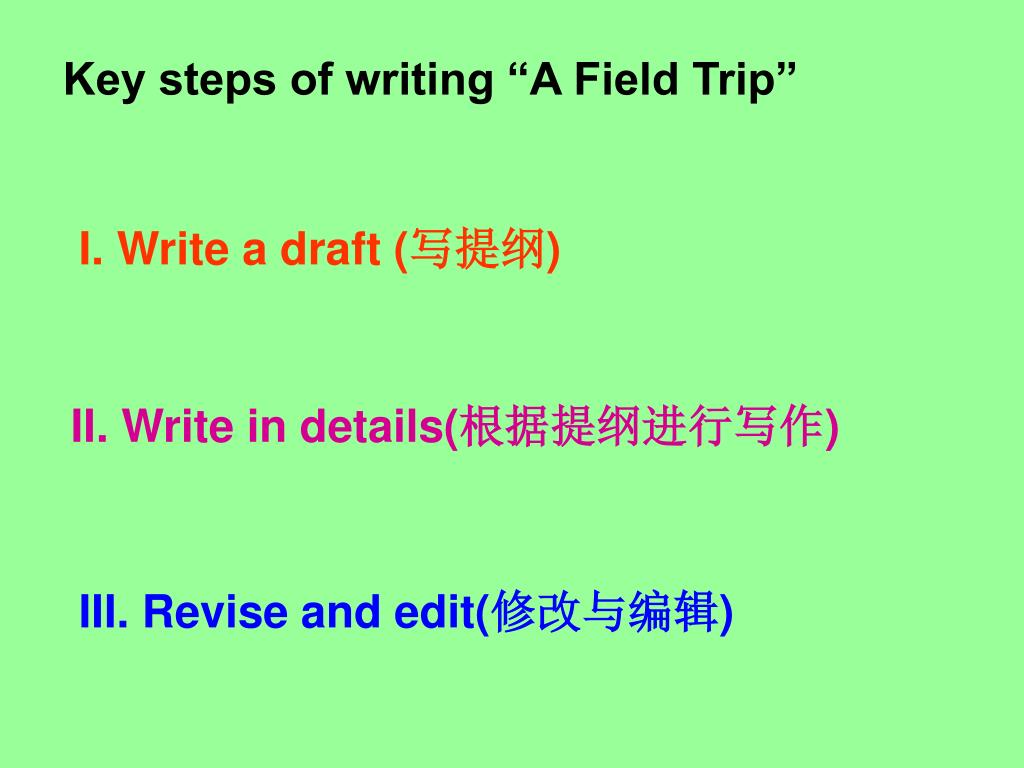 Key steps of writing “A Field Trip” I. Write a draft (写提纲) II. Write in details(根据提纲进行写作) III. Revise and edit(修改与编辑)