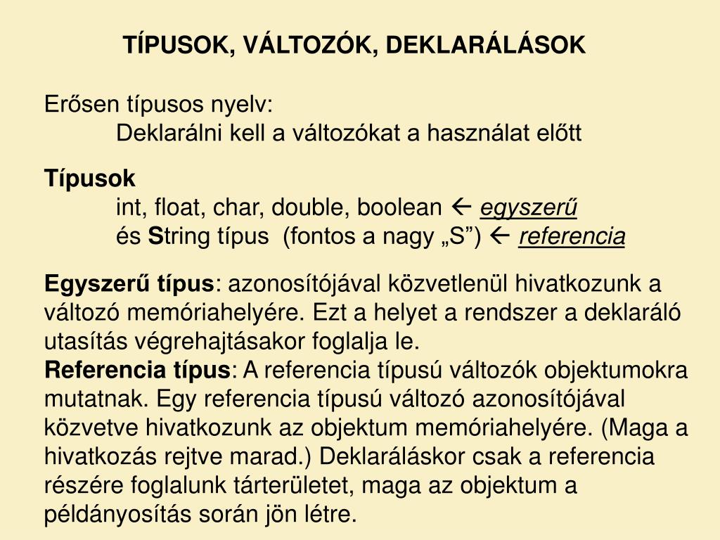 TÍPUSOK, VÁLTOZÓK, DEKLARÁLÁSOK • Erősen típusos nyelv: • Deklarálni kell a változókat a használat előtt • Típusok • int, float, char, double, boolean egyszerű • és String típus (fontos a nagy „S”) referencia Egyszerű típus: azonosítójával közvetlenül hivatkozunk a változó memóriahelyére. Ezt a helyet a rendszer a deklaráló utasítás végrehajtásakor foglalja le. Referencia típus: A referencia típusú változók objektumokra mutatnak. Egy referencia típusú változó azonosítójával közvetve hivatkozunk az objektum memóriahelyére. (Maga a hivatkozás rejtve marad.) Deklaráláskor csak a referencia részére foglalunk tárterületet, maga az objektum a példányosítás során jön létre.