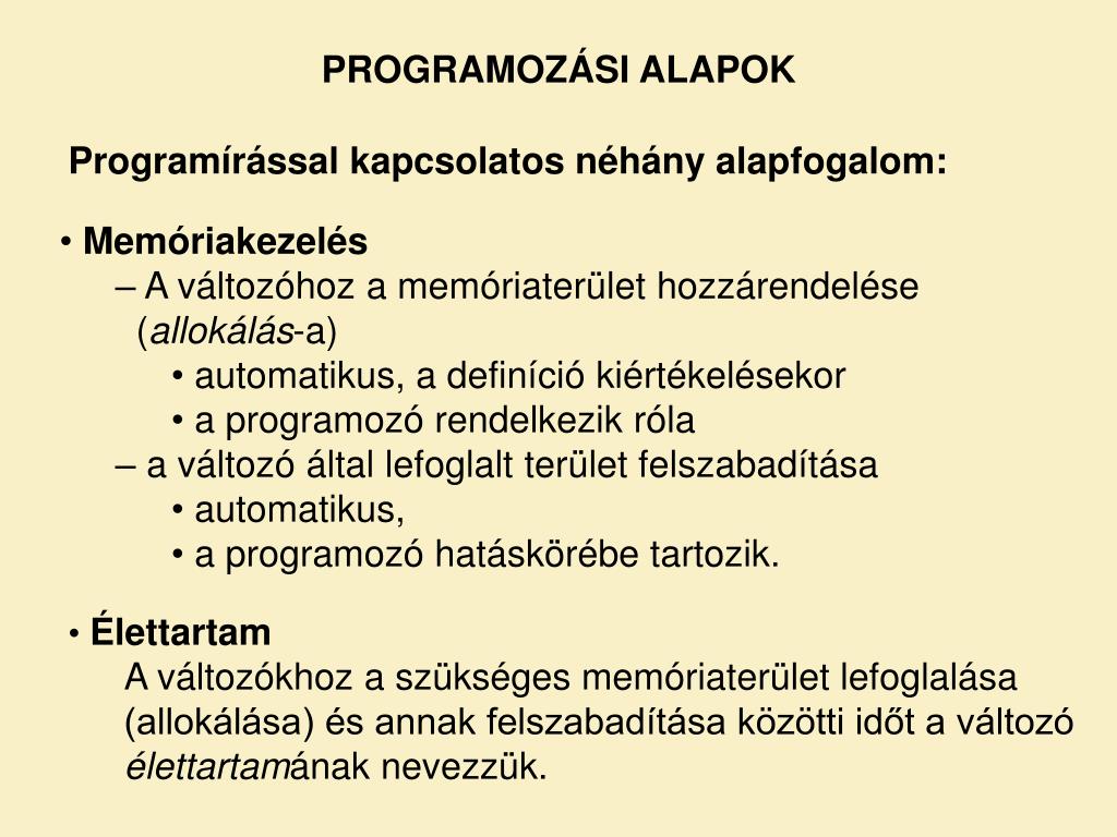 PROGRAMOZÁSI ALAPOK Programírással kapcsolatos néhány alapfogalom: • • Memóriakezelés • – A változóhoz a memóriaterület hozzárendelése (allokálás-a) • automatikus, a definíció kiértékelésekor • a programozó rendelkezik róla • – a változó által lefoglalt terület felszabadítása • automatikus, • a programozó hatáskörébe tartozik. • Élettartam • A változókhoz a szükséges memóriaterület lefoglalása (allokálása) és annak felszabadítása közötti időt a változó élettartamának nevezzük.