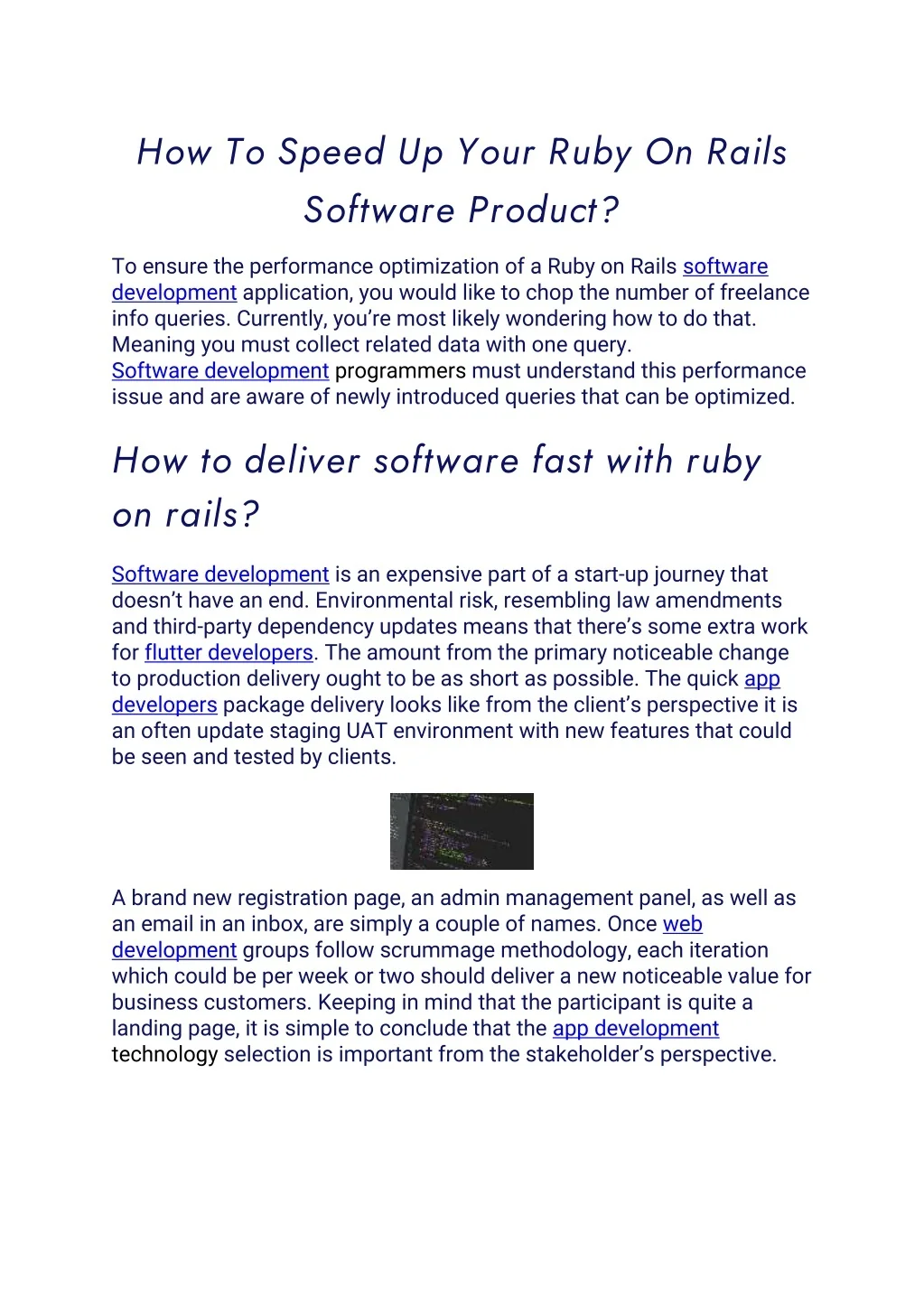 How To Speed Up Your Ruby On Rails Software Product? To ensure the performance optimization of a Ruby on Rails software development application, you would like to chop the number of freelance info queries. Currently, you’re most likely wondering how to do that. Meaning you must collect related data with one query. Software development programmers must understand this performance issue and are aware of newly introduced queries that can be optimized. How to deliver software fast with ruby on rails? Software development is an expensive part of a start-up journey that doesn’t have an end. Environmental risk, resembling law amendments and third-party dependency updates means that there’s some extra work for flutter developers. The amount from the primary noticeable change to production delivery ought to be as short as possible. The quick app developers package delivery looks like from the client’s perspective it is an often update staging UAT environment with new features that could be seen and tested by clients. A brand new registration page, an admin management panel, as well as an email in an inbox, are simply a couple of names. Once web development groups follow scrummage methodology, each iteration which could be per week or two should deliver a new noticeable value for business customers. Keeping in mind that the participant is quite a landing page, it is simple to conclude that the app development technology selection is important from the stakeholder’s perspective.