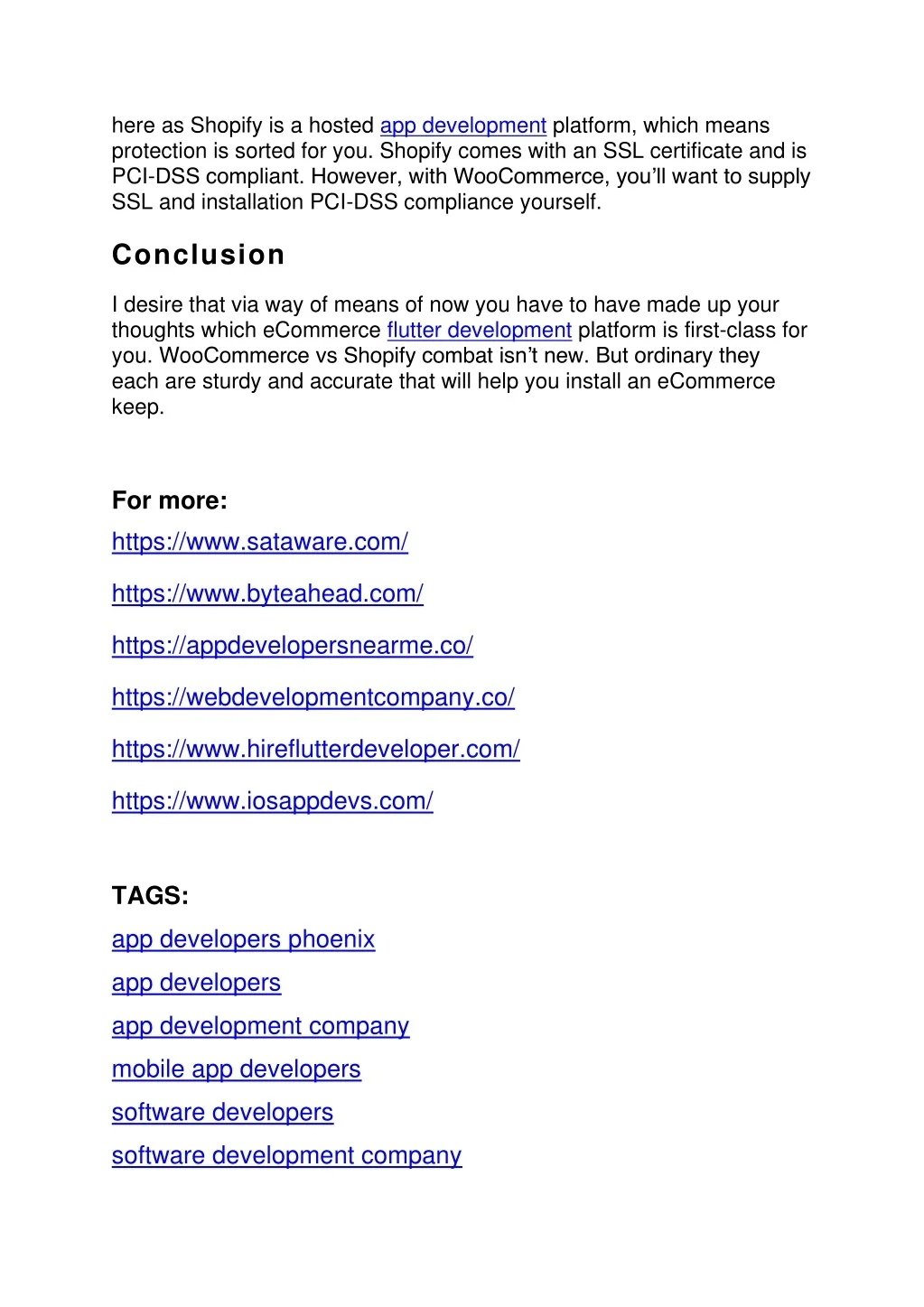 here as Shopify is a hosted app development platform, which means protection is sorted for you. Shopify comes with an SSL certificate and is PCI-DSS compliant. However, with WooCommerce, you’ll want to supply SSL and installation PCI-DSS compliance yourself. Conclusion I desire that via way of means of now you have to have made up your thoughts which eCommerce flutter development platform is first-class for you. WooCommerce vs Shopify combat isn’t new. But ordinary they each are sturdy and accurate that will help you install an eCommerce keep. For more: https://www.sataware.com/ https://www.byteahead.com/ https://appdevelopersnearme.co/ https://webdevelopmentcompany.co/ https://www.hireflutterdeveloper.com/ https://www.iosappdevs.com/ TAGS: app developers phoenix app developers app development company mobile app developers software developers software development company