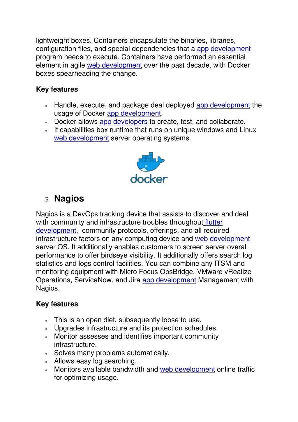 lightweight boxes. Containers encapsulate the binaries, libraries, configuration files, and special dependencies that a app development program needs to execute. Containers have performed an essential element in agile web development over the past decade, with Docker boxes spearheading the change. Key features •Handle, execute, and package deal deployed app development the usage of Docker app development. •Docker allows app developers to create, test, and collaborate. •It capabilities box runtime that runs on unique windows and Linux web development server operating systems. 3.Nagios Nagios is a DevOps tracking device that assists to discover and deal with community and infrastructure troubles throughout flutter development, community protocols, offerings, and all required infrastructure factors on any computing device and web development server OS. It additionally enables customers to screen server overall performance to offer birdseye visibility. It additionally offers search log statistics and logs control facilities. You can combine any ITSM and monitoring equipment with Micro Focus OpsBridge, VMware vRealize Operations, ServiceNow, and Jira app development Management with Nagios. Key features •This is an open diet, subsequently loose to use. •Upgrades infrastructure and its protection schedules. •Monitor assesses and identifies important community infrastructure. •Solves many problems automatically. •Allows easy log searching. •Monitors available bandwidth and web development online traffic for optimizing usage.