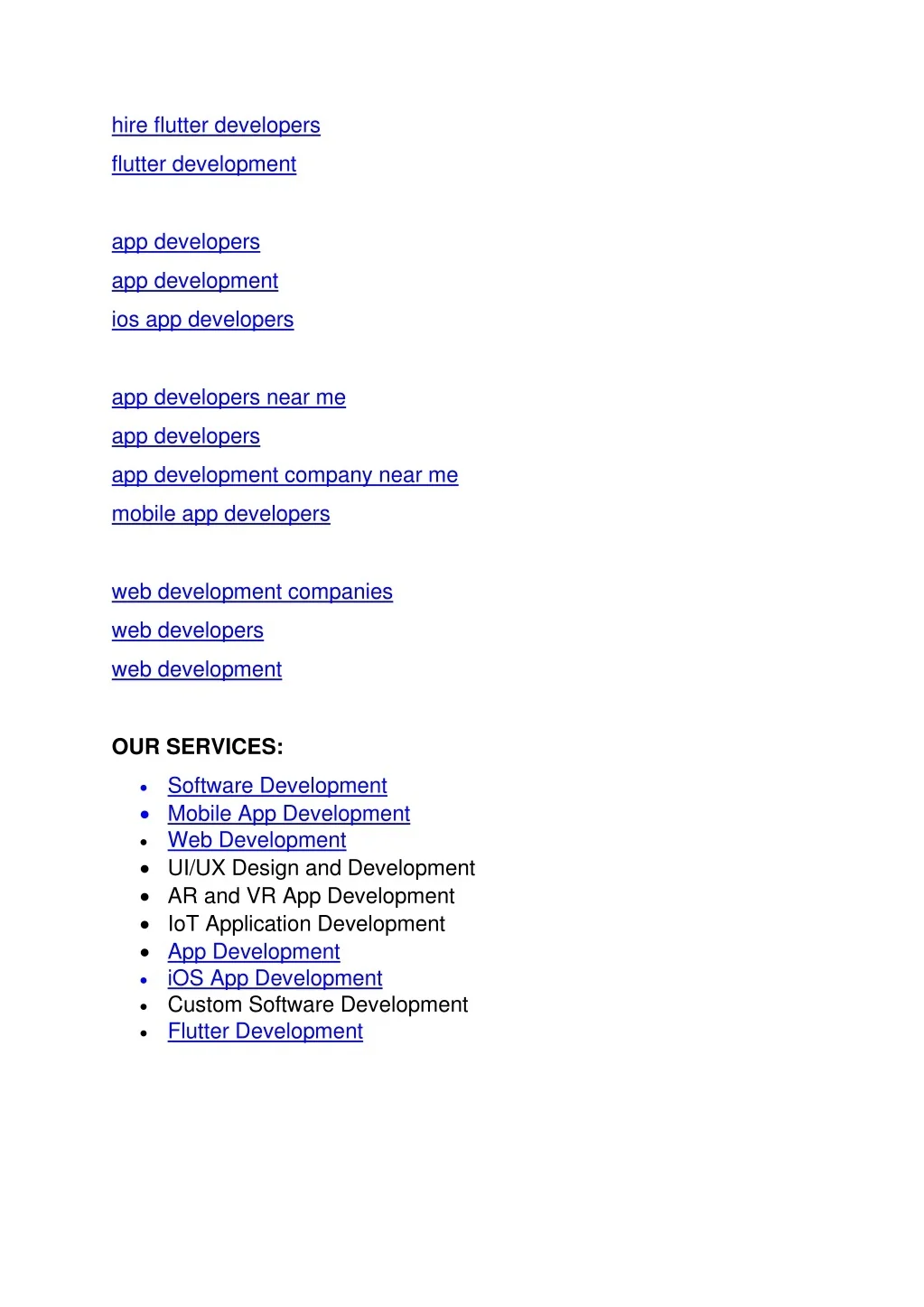 hire flutter developers flutter development app developers app development ios app developers app developers near me app developers app development company near me mobile app developers web development companies web developers web development OUR SERVICES: •Software Development • Mobile App Development •Web Development • UI/UX Design and Development • AR and VR App Development • IoT Application Development • App Development •iOS App Development •Custom Software Development •Flutter Development