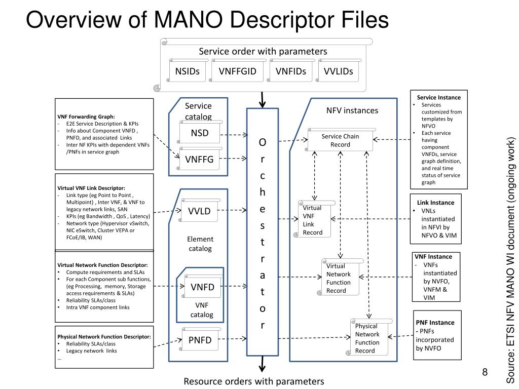 NFV Entities to deploy and manage • Network Service (NS): • described by its descriptor file, orchestrated by NFVO, • may cover 1 or more VNF Graphs, VNFs and PNFs. • VNF Forwarding Graph (VNF-FG): • described by its descriptor file, orchestrated by NFVO, • may cover VNF-FGs, VNFs and NFs • VNF: • described by its descriptor file, instantiated by the VNF Manager, • covers VNF components (VNFC) each mapped to a VM described with the Virtual Deployment Unit descriptor. NetworkService 1 1..n VNF VNF Forwarding Graph 1..n 0..n 7