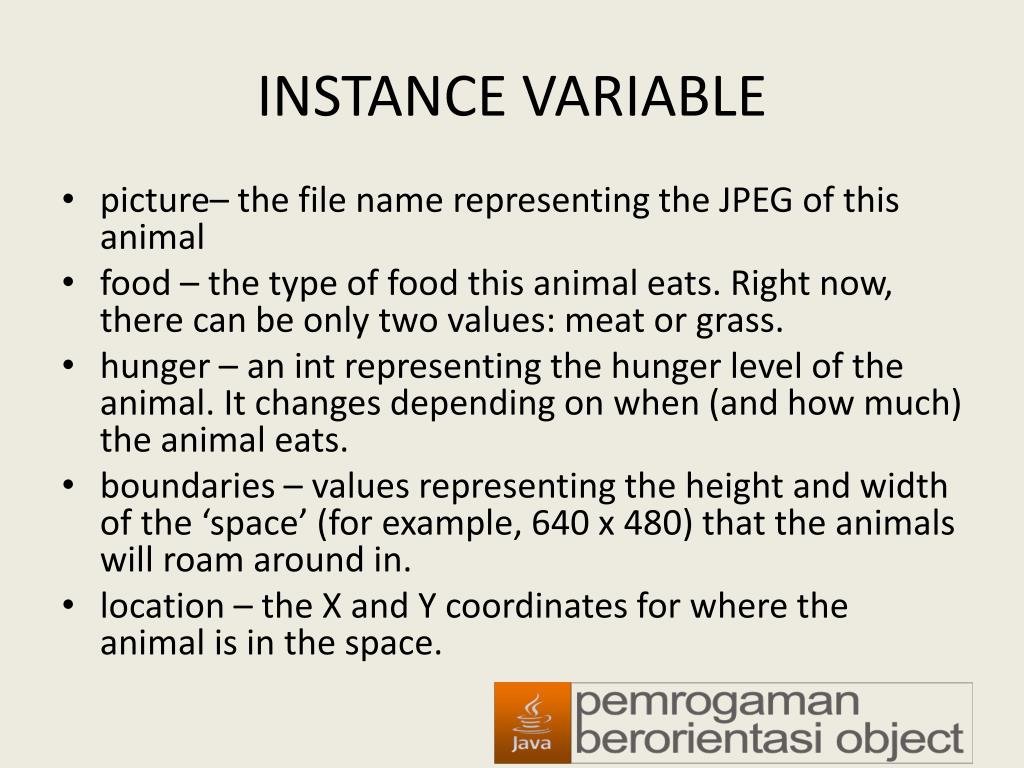 INSTANCE VARIABLE • picture– the file name representing the JPEG of this animal • food – the type of food this animal eats. Right now, there can be only two values: meat or grass. • hunger – an int representing the hunger level of the animal. It changes depending on when (and how much) the animal eats. • boundaries – values representing the height and width of the ‘space’ (for example, 640 x 480) that the animals will roam around in. • location – the X and Y coordinates for where the animal is in the space.