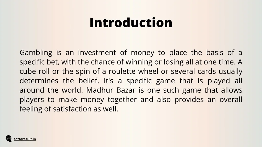 Introduction Gambling is an investment of money to place the basis of a specific bet, with the chance of winning or losing all at one time. A cube roll or the spin of a roulette wheel or several cards usually determines the belief. It's a specific game that is played all around the world. Madhur Bazar is one such game that allows players to make money together and also provides an overall feeling of satisfaction as well. sattaresult.in