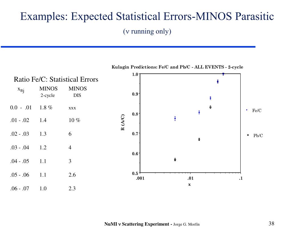 Examples: Expected Statistical Errors-MINOS Parasitic(n running only) Ratio Fe/C: Statistical Errors xBjMINOS MINOS 2-cycle DIS 0.0 - .011.8 % xxx .01 - .02 1.4 10 % .02 - .03 1.3 6 .03 - .04 1.2 4 .04 - .05 1.1 3 .05 - .06 1.1 2.6 .06 - .07 1.0 2.3 NuMI n Scattering Experiment - Jorge G. Morfín