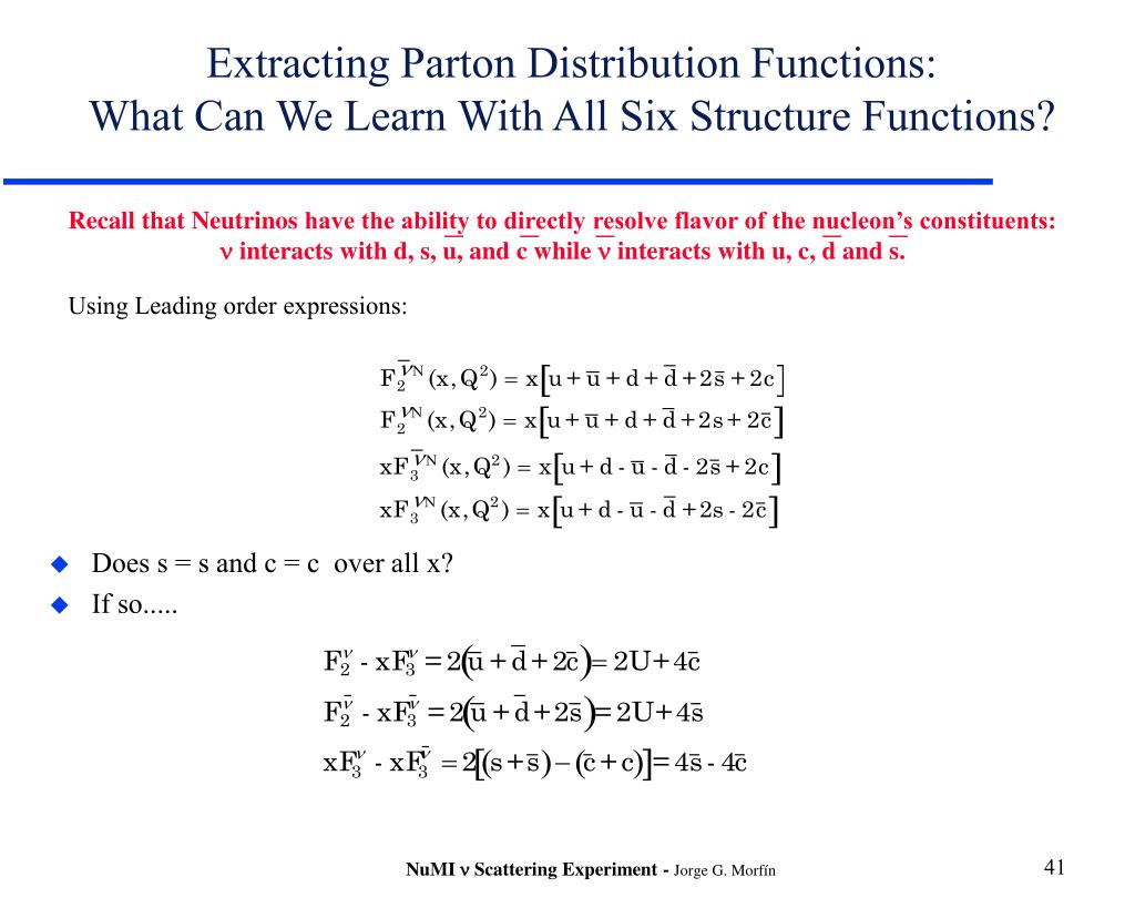 Extracting Parton Distribution Functions:What Can We Learn With All Six Structure Functions? Recall that Neutrinoshave the ability to directly resolve flavor of the nucleon’s constituents: interacts with d, s, u, and c while interacts with u, c, d and s. Using Leading order expressions: • Does s = s and c = c over all x? • If so..... NuMI n Scattering Experiment - Jorge G. Morfín