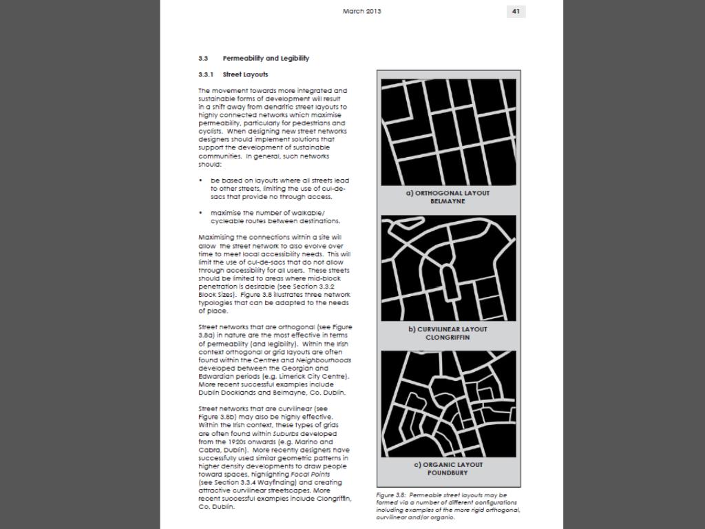 DMURS – Practical Implications • Street Networks (3.3.1) • Filtered permeability • Orthogonal (Fig 3.8) • Curvilinear • Organic