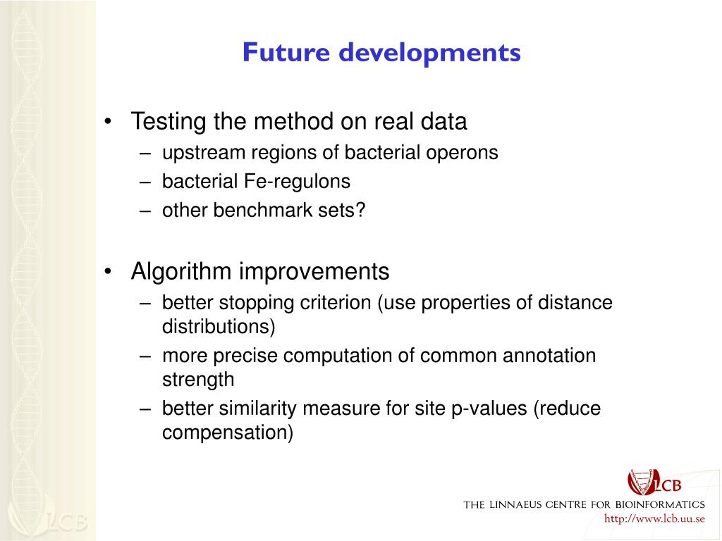 Future developments • Testing the method on real data • upstream regions of bacterial operons • bacterial Fe-regulons • other benchmark sets? • Algorithm improvements • better stopping criterion (use properties of distance distributions) • more precise computation of common annotation strength • better similarity measure for site p-values (reduce compensation)