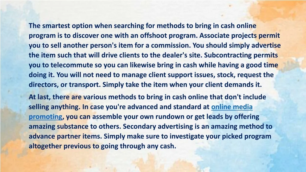 The smartest option when searching for methods to bring in cash online program is to discover one with an offshoot program. Associate projects permit you to sell another person's item for a commission. You should simply advertise the item such that will drive clients to the dealer's site. Subcontracting permits you to telecommute so you can likewise bring in cash while having a good time doing it. You will not need to manage client support issues, stock, request the directors, or transport. Simply take the item when your client demands it. At last, there are various methods to bring in cash online that don't include selling anything. In case you're advanced and standard at online media promoting, you can assemble your own rundown or get leads by offering amazing substance to others. Secondary advertising is an amazing method to advance partner items. Simply make sure to investigate your picked program altogether previous to going through any cash.