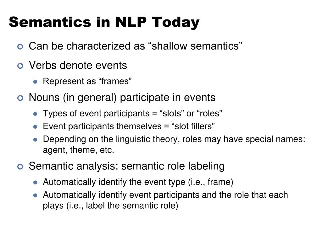 Semantics in NLP Today • Can be characterized as “shallow semantics” • Verbs denote events • Represent as “frames” • Nouns (in general) participate in events • Types of event participants = “slots” or “roles” • Event participants themselves = “slot fillers” • Depending on the linguistic theory, roles may have special names: agent, theme, etc. • Semantic analysis: semantic role labeling • Automatically identify the event type (i.e., frame) • Automatically identify event participants and the role that each plays (i.e., label the semantic role)