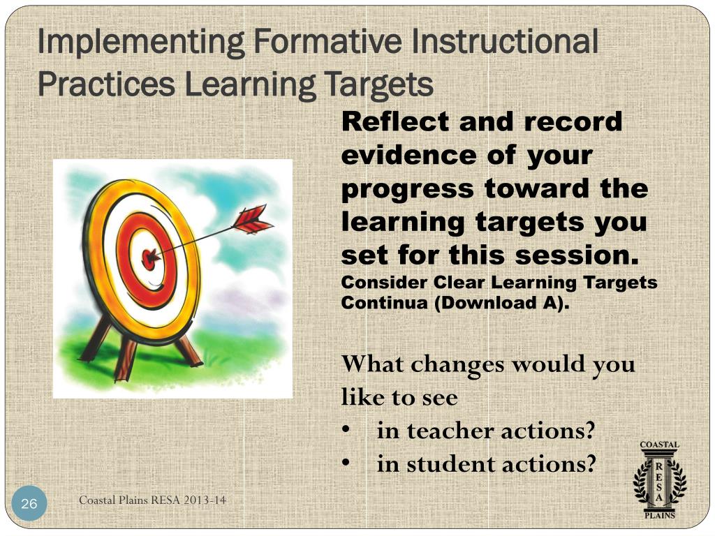 Implementing Formative Instructional Practices Learning Targets • Reflect and record evidence of your progress toward the learning targets you set for this session. • Consider Clear Learning Targets Continua (Download A). • What changes would you like to see • in teacher actions? • in student actions? Coastal Plains RESA 2013-14