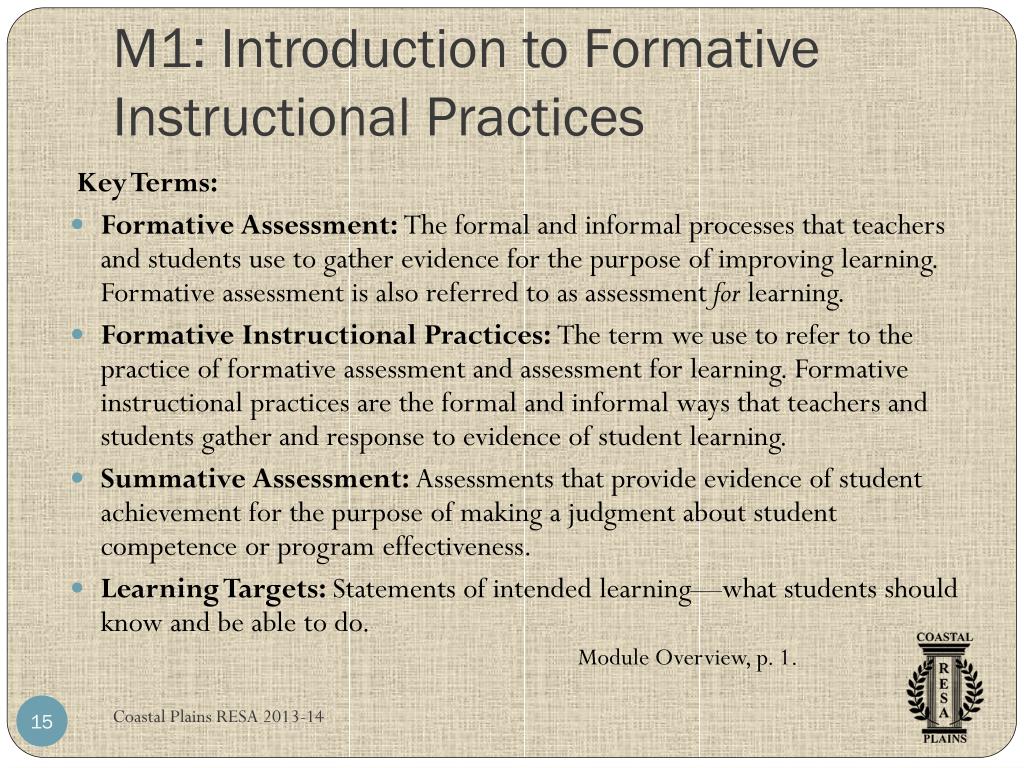 M1: Introduction to Formative Instructional Practices Key Terms: • Formative Assessment: The formal and informal processes that teachers and students use to gather evidence for the purpose of improving learning. Formative assessment is also referred to as assessment for learning. • Formative Instructional Practices: The term we use to refer to the practice of formative assessment and assessment for learning. Formative instructional practices are the formal and informal ways that teachers and students gather and response to evidence of student learning. • Summative Assessment: Assessments that provide evidence of student achievement for the purpose of making a judgment about student competence or program effectiveness. • Learning Targets: Statements of intended learning—what students should know and be able to do. Module Overview, p. 1. Coastal Plains RESA 2013-14