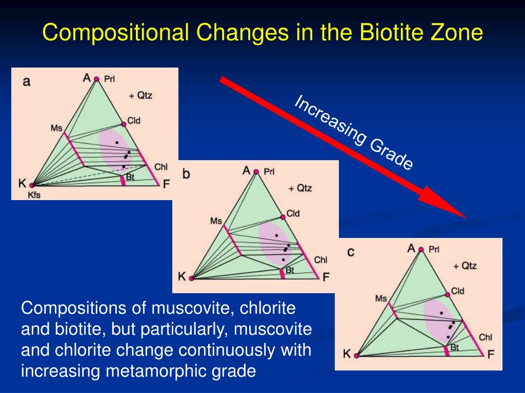 Compositional Changes in the Biotite Zone Increasing Grade Compositions of muscovite, chlorite and biotite, but particularly, muscovite and chlorite change continuously with increasing metamorphic grade
