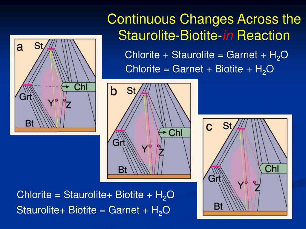 Continuous Changes Across the Staurolite-Biotite-in Reaction Chlorite + Staurolite = Garnet + H2O Chlorite = Garnet + Biotite + H2O Chlorite = Staurolite+ Biotite + H2O Staurolite+ Biotite = Garnet + H2O
