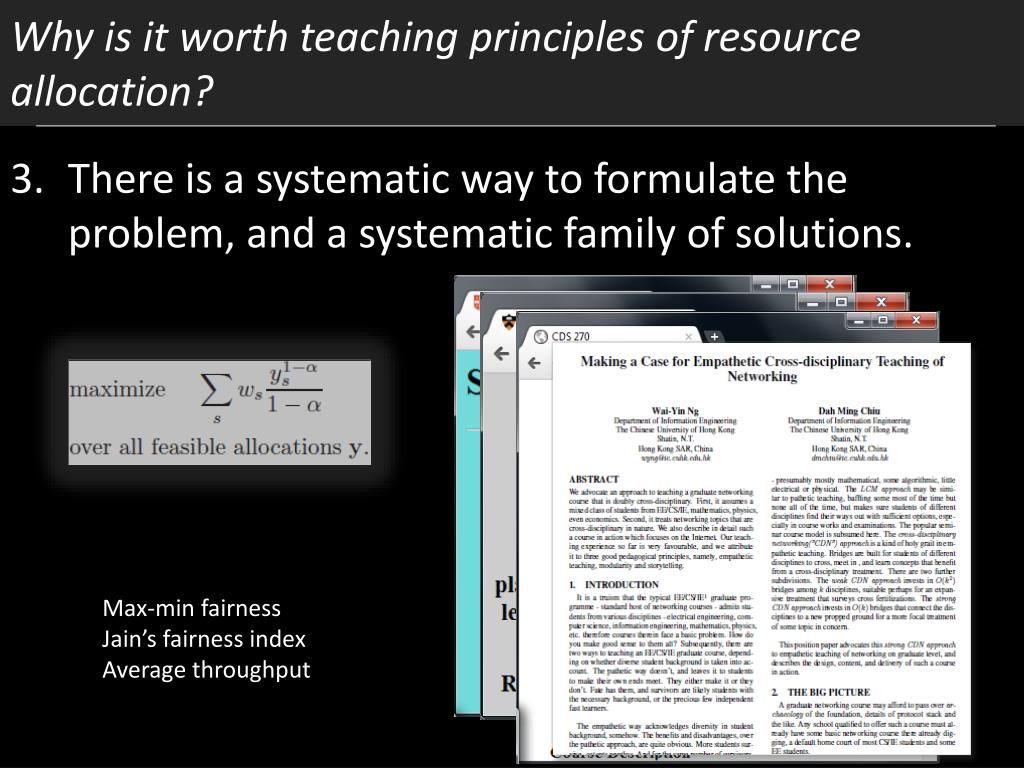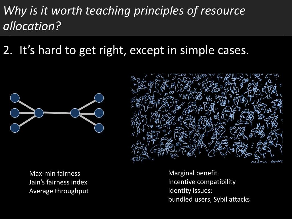 Why is it worth teaching principles of resource allocation? There is a systematic way to formulate the problem, and a systematic family of solutions. Marginal benefit Incentive compatibility Identity issues: bundled users, Sybil attacks Max-min fairness Jain’s fairness index Average throughput