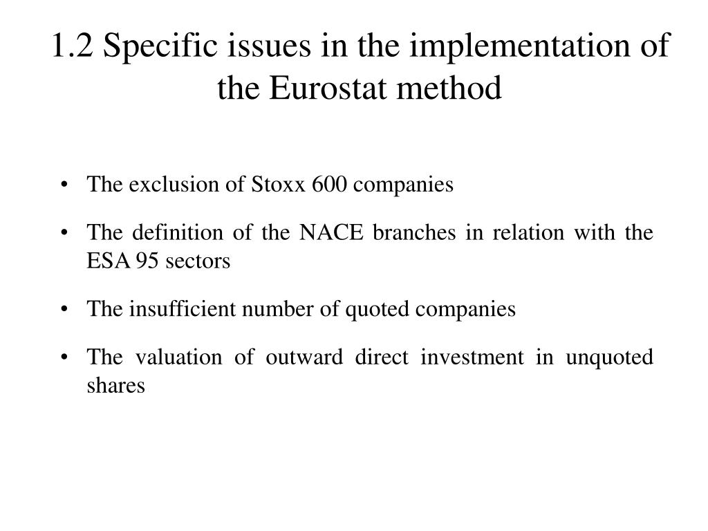 1.2 Specific issues in the implementation of the Eurostat method • The exclusion of Stoxx 600 companies • The definition of the NACE branches in relation with the ESA 95 sectors • The insufficient number of quoted companies • The valuation of outward direct investment in unquoted shares