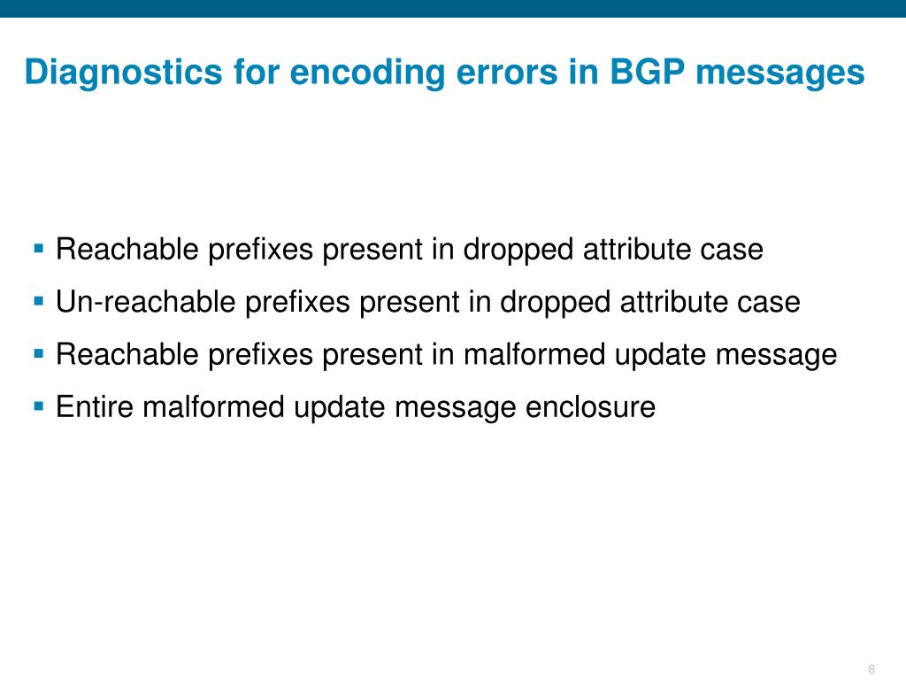 Diagnostics for encoding errors in BGP messages • Reachable prefixes present in dropped attribute case • Un-reachable prefixes present in dropped attribute case • Reachable prefixes present in malformed update message • Entire malformed update message enclosure