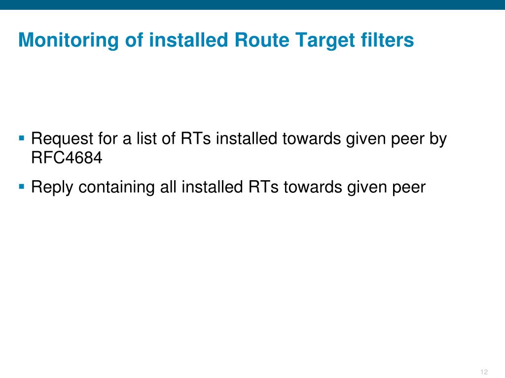 Monitoring of installed Route Target filters • Request for a list of RTs installed towards given peer by RFC4684 • Reply containing all installed RTs towards given peer