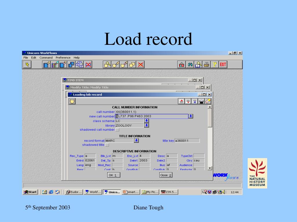 SmartPORT at NHM • Use to capture a complete cataloguing record and replace an existing brief record. • External databases used – OCLC & RLIN. • Not used yet at NHM for acquisition purposes or for new authorities. Diane Tough