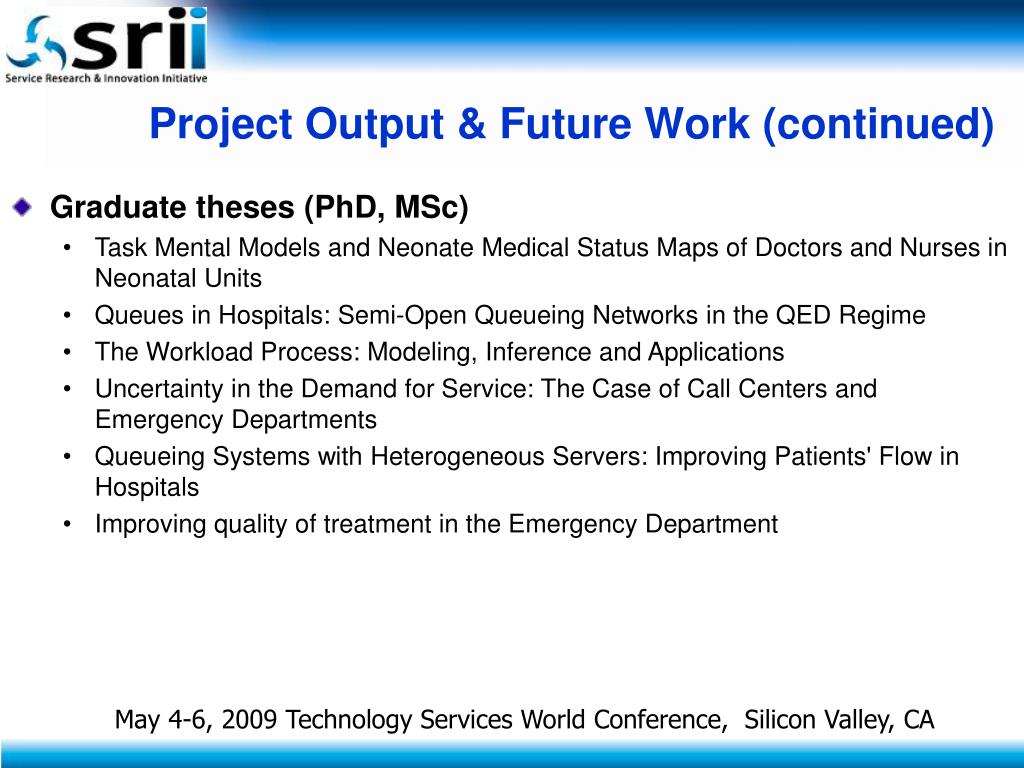 Project Output & Future Work (continued) • Graduate theses (PhD, MSc) • Task Mental Models and Neonate Medical Status Maps of Doctors and Nurses in Neonatal Units • Queues in Hospitals: Semi-Open Queueing Networks in the QED Regime • The Workload Process: Modeling, Inference and Applications • Uncertainty in the Demand for Service: The Case of Call Centers and Emergency Departments • Queueing Systems with Heterogeneous Servers: Improving Patients' Flow in Hospitals • Improving quality of treatment in the Emergency Department