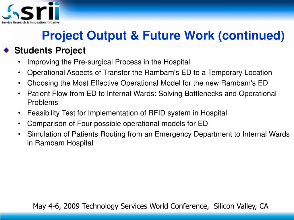 Project Output & Future Work (continued) • Students Project • Improving the Pre-surgical Process in the Hospital • Operational Aspects of Transfer the Rambam's ED to a Temporary Location • Choosing the Most Effective Operational Model for the new Rambam's ED • Patient Flow from ED to Internal Wards: Solving Bottlenecks and Operational Problems • Feasibility Test for Implementation of RFID system in Hospital • Comparison of Four possible operational models for ED • Simulation of Patients Routing from an Emergency Department to Internal Wards in Rambam Hospital