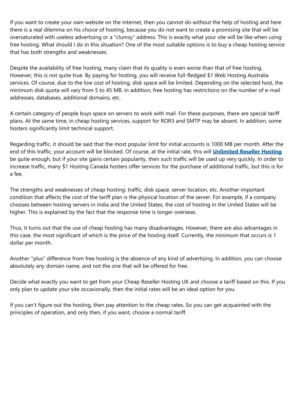 If you want to create your own website on the Internet, then you cannot do without the help of hosting and here there is a real dilemma on his choice of hosting, because you do not want to create a promising site that will be oversaturated with useless advertising or a "clumsy" address. This is exactly what your site will be like when using free hosting. What should I do in this situation? One of the most suitable options is to buy a cheap hosting service that has both strengths and weaknesses. Despite the availability of free hosting, many claim that its quality is even worse than that of free hosting. However, this is not quite true. By paying for hosting, you will receive full-fledged $1 Web Hosting Australia services. Of course, due to the low cost of hosting, disk space will be limited. Depending on the selected host, the minimum disk quota will vary from 5 to 45 MB. In addition, free hosting has restrictions on the number of e-mail addresses, databases, additional domains, etc. A certain category of people buys space on servers to work with mail. For these purposes, there are special tariff plans. At the same time, in cheap hosting services, support for ROR3 and SMTP may be absent. In addition, some hosters significantly limit technical support. Regarding traffic, it should be said that the most popular limit for initial accounts is 1000 MB per month. After the end of this traffic, your account will be blocked. Of course, at the initial rate, this will Unlimited Reseller Hosting be quite enough, but if your site gains certain popularity, then such traffic will be used up very quickly. In order to increase traffic, many $1 Hosting Canada hosters offer services for the purchase of additional traffic, but this is for a fee. The strengths and weaknesses of cheap hosting: traffic, disk space, server location, etc. Another important condition that affects the cost of the tariff plan is the physical location of the server. For example, if a company chooses between hosting servers in India and the United States, the cost of hosting in the United States will be higher. This is explained by the fact that the response time is longer overseas. Thus, it turns out that the use of cheap hosting has many disadvantages. However, there are also advantages in this case, the most significant of which is the price of the hosting itself. Currently, the minimum that occurs is 1 dollar per month. Another "plus" difference from free hosting is the absence of any kind of advertising. In addition, you can choose absolutely any domain name, and not the one that will be offered for free. Decide what exactly you want to get from your Cheap Reseller Hosting UK and choose a tariff based on this. If you only plan to update your site occasionally, then the initial rates will be an ideal option for you. If you can't figure out the hosting, then pay attention to the cheap rates. So you can get acquainted with the principles of operation, and only then, if you want, choose a normal tariff.