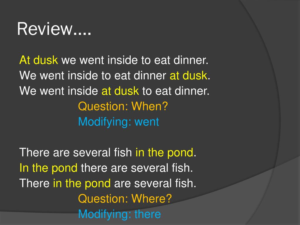 Review…. At dusk we went inside to eat dinner. We went inside to eat dinner at dusk. We went inside at dusk to eat dinner. Question: When? Modifying: went There are several fish in the pond. In the pond there are several fish. There in the pond are several fish. Question: Where? Modifying: there