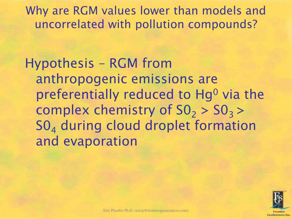 Why are RGM values lower than models and uncorrelated with pollution compounds? Hypothesis – RGM from anthropogenic emissions are preferentially reduced to Hg0 via the complex chemistry of S02 > S03 > S04 during cloud droplet formation and evaporation Eric Prestbo Ph.D. (ericp@frontiergeosciences.com)