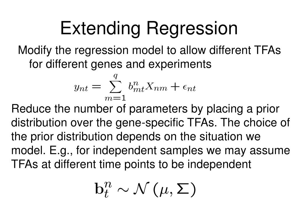 Extending Regression Modify the regression model to allow different TFAs for different genes and experiments Reduce the number of parameters by placing a prior distribution over the gene-specific TFAs. The choice of the prior distribution depends on the situation we model. E.g., for independent samples we may assume TFAs at different time points to be independent