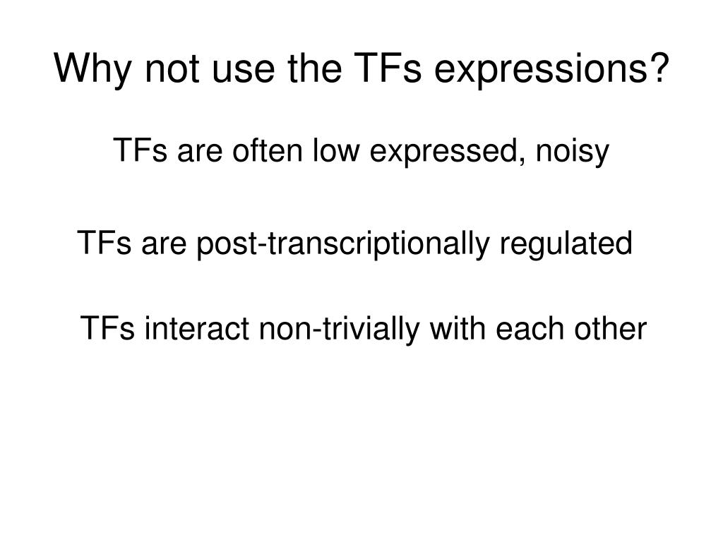 Why not use the TFs expressions? TFs are often low expressed, noisy TFs are post-transcriptionally regulated TFs interact non-trivially with each other