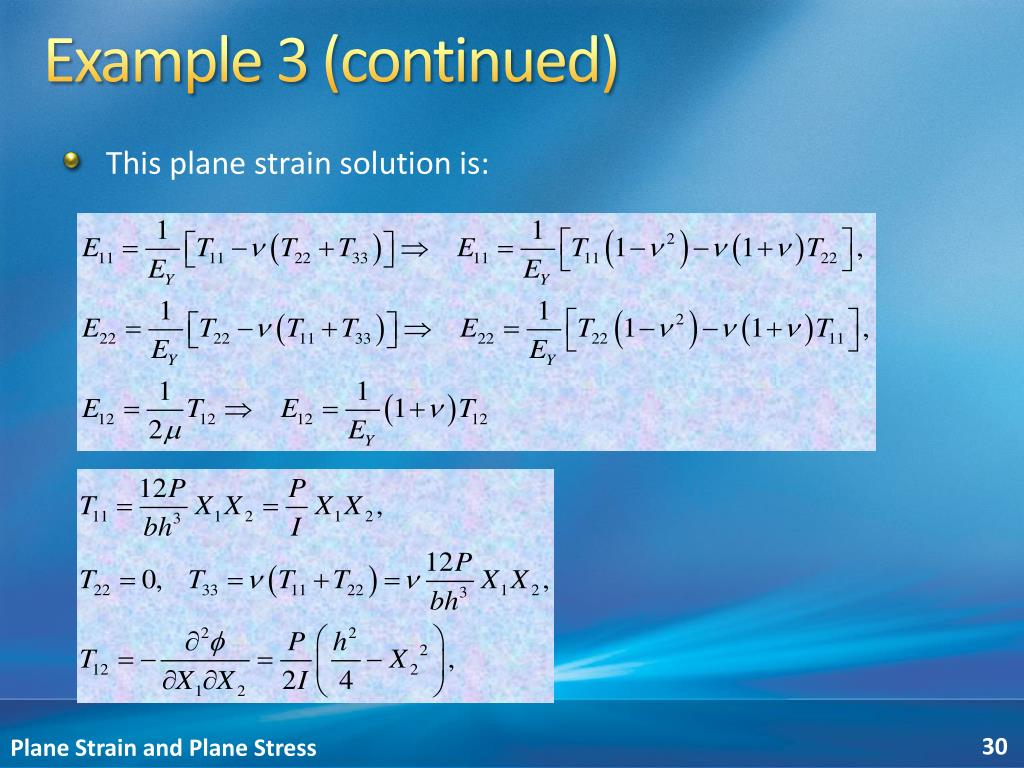 Example 3 (continued) • If the beam is in a plane strain condition , there will be normal compressive stresses on the boundary whose magnitude is given by 29 Plane Strain and Plane Stress