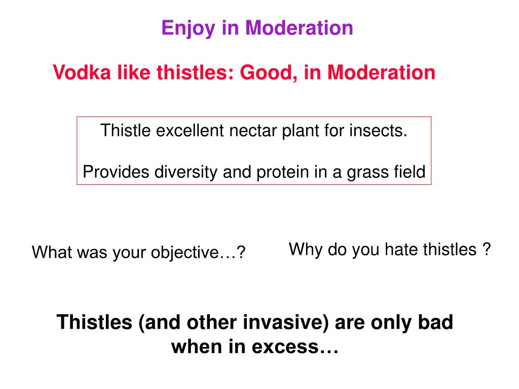 Enjoy in Moderation Vodka like thistles: Good, in Moderation Thistle excellent nectar plant for insects. Provides diversity and protein in a grass field Why do you hate thistles ? What was your objective…? Thistles (and other invasive) are only bad when in excess…